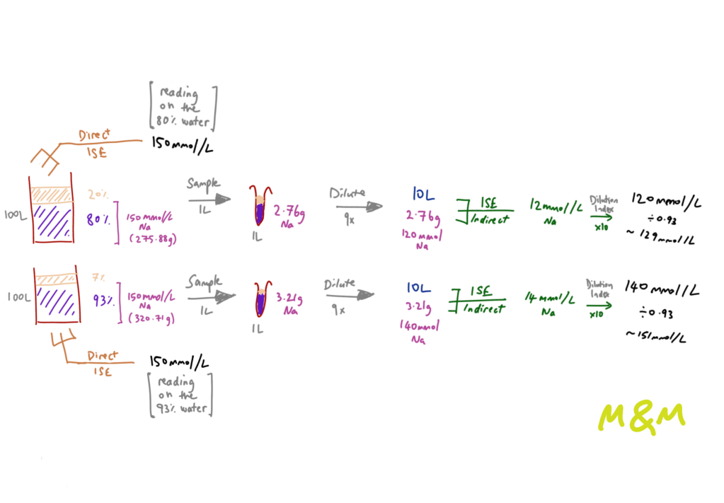This dilution step (that is not needed in direct ISE) and reliance on whole plasma volume, as opposed to the water fraction which is where the [Na+] concentration is physiologically relevant, is where the pseudo comes in. These analysers assume the 93:7 composition, and in cases where this ratio is upset, we run into systematic errors that are only magnified by the dilution factor. Common examples of the lost golden ratio include good going hyperlipidemia, and protein-rich states such as multiple myeloma, post-intravenous immunoglobulin (IVIg) and me after two scoops of whey protein. This also works the other way round – i.e. pseudo-hypernatremia – in protein-poor states, or may result in pseudo-normalisation of sodium in hypernatremic states.