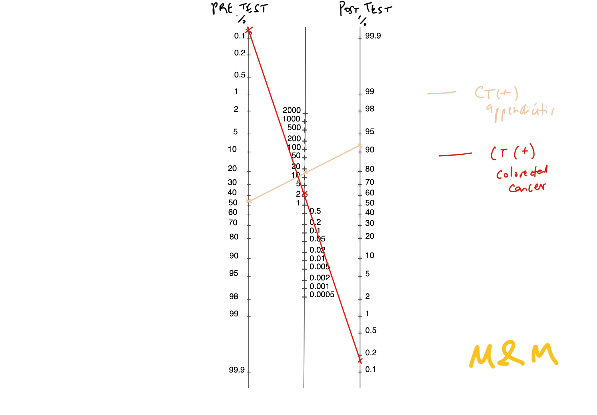 Well, here is where the surprise comes. A recent study estimates the risk of colorectal cancer as around 3 per 100 000 [2] assuming no background risk factors in this age group, a pre-test probability of 0.003%. Radiopedia cites a few studies demonstrating a sensitivity of 77% and specificity of 70% in the T-staging of colorectal cancer [3]. Keep in mind, these sensitivity and specificity figures are huge over-estimates in our clinical context – these studies were generally done in patients with known and more advanced stages of colon cancer, and a provided history that is longer than “abdominal pain” prompting a closer look.