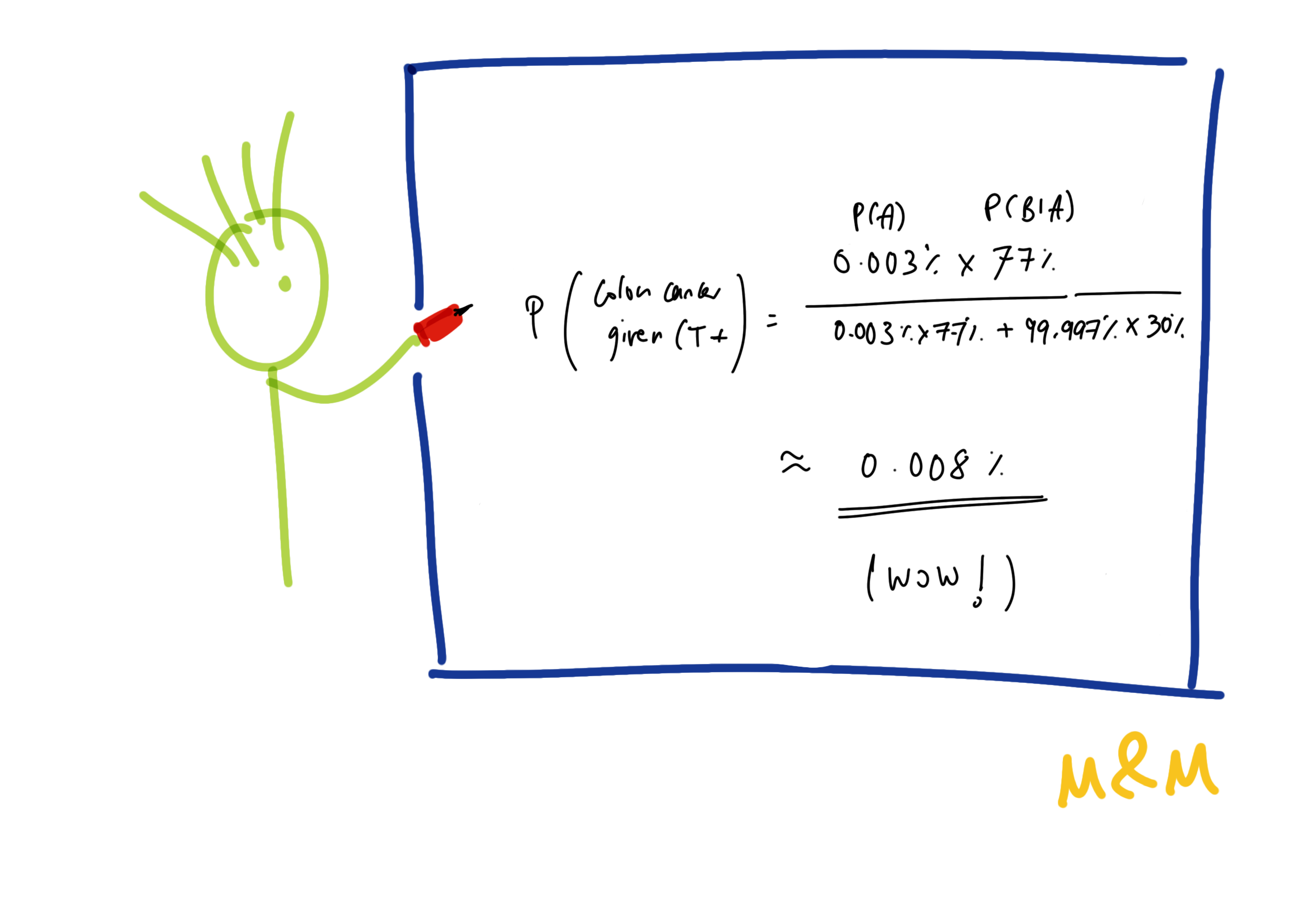 Bayes tells us, the actual chance of colon cancer after this positive CT finding is a shocking 0.008%, despite our optimistic over-estimates. That’s it. This paradoxical reality arises from the fact that often, pre-test probabilities are low and tests are quite imperfect. As you can see, this also completely turns clinical practice on its head, because in what world does that patient not get a delayed colonoscopy? In contrast, colonoscopy perforation rates are around 0.7% (10x the colon cancer risk here) [4], and a hatred of bowel prep is closer to 100% as per my anecdotal knowledge.
