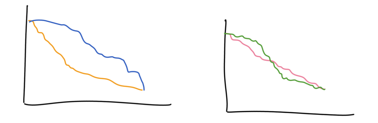Hazards are helpful to understand the progression of these outcomes with relation to time, leading up to the primary endpoint. In contrast, odds ratios and relative risk are more opaque to how time is a factor in how we arrive to the endpoint. For example, these curves below would have different hazard ratios but the same odds and relative risk by the end. These curves also violate the ‘proportional hazards’ assumption which is that the ratio of events happening in each group is the same throughout the whole study, which makes computing the hazards ratio a bit tricky.