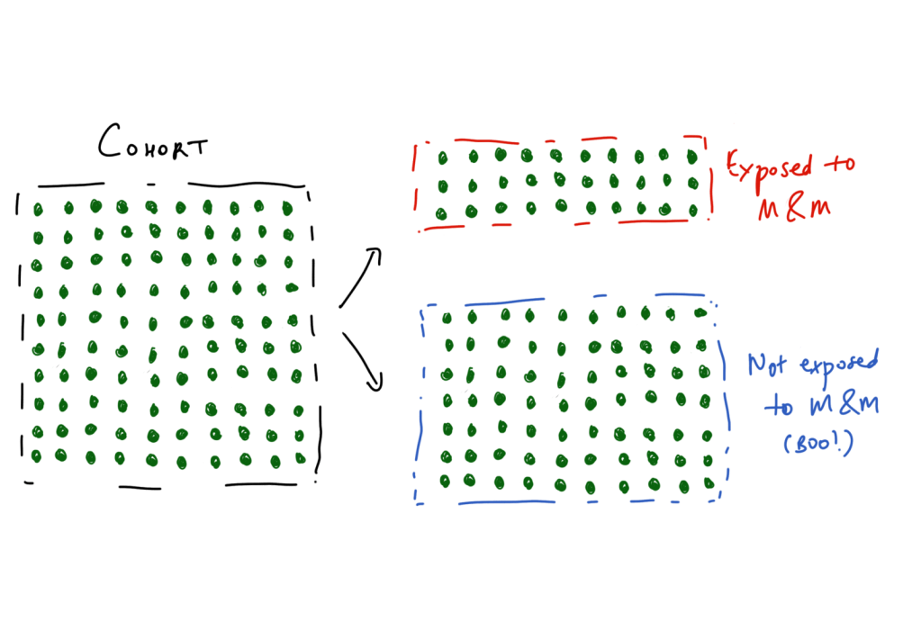 Say we have a 100 strong cohort of medical graduates and we are interested to see whether their exposure to Myths and Maladies influences their statistical literacy, and we follow these graduates over their first two years of work. Because of marketing limitations, and an unwillingness to branch out more readily to alternative forms of multimedia, only a limited number of them are exposed to M&M – in this example, an optimistic 30%.