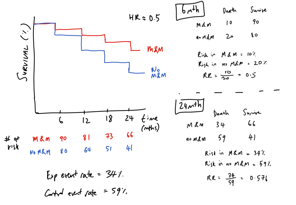Effectively, this comes out to M&M being represented as 0.9#6mthly intervals and no M&M being represented as 0.8#6mthly intervals. Compound interest! You can see that if we do a cross-section (aka relative risk) at the 6 month timepoint, the RR equals the HR – this first time point is the only time that this can hold true. As we follow up our cohort longer, the RR and HR diverge – the HR remains the same, but the relative risk (and the odds) changes overtime. Effectively, this means that a HR of 0.5 does not mean a “50% lower risk of death” as it is often incorrectly reported.